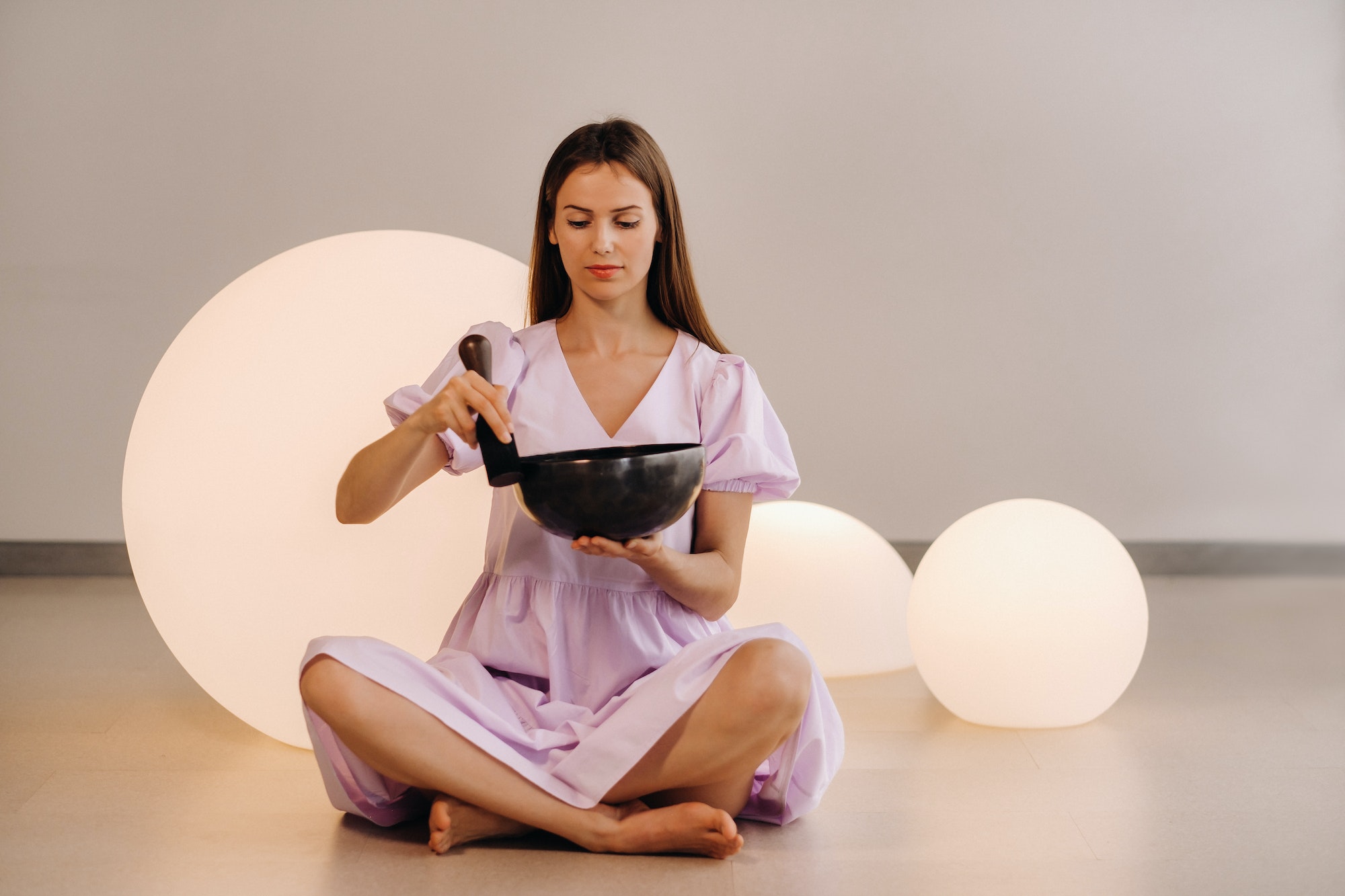 Portrait of a female yoga teacher playing a Tibetan bowl or singing a bell in the gym during a yoga